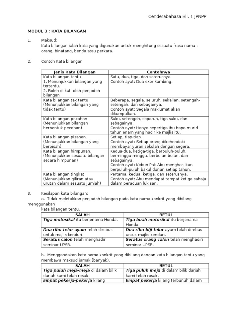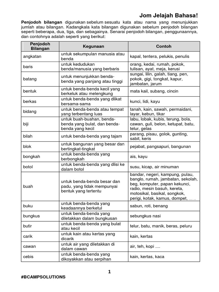 Kadangkala kata bilangan digunakan sebelum penjodoh bilangan seperti beberapa dua tiga dan sebagainya. Penjodoh bilangan digunakan untuk. Dalam bahasa Melayu penjodoh bilangan ialah kata yang digunakan bersama-sama dengan kata bilangan untuk membilang kata nama konkrit bukan abstrak seperti orang haiwan benda tempat dan sebagainya.